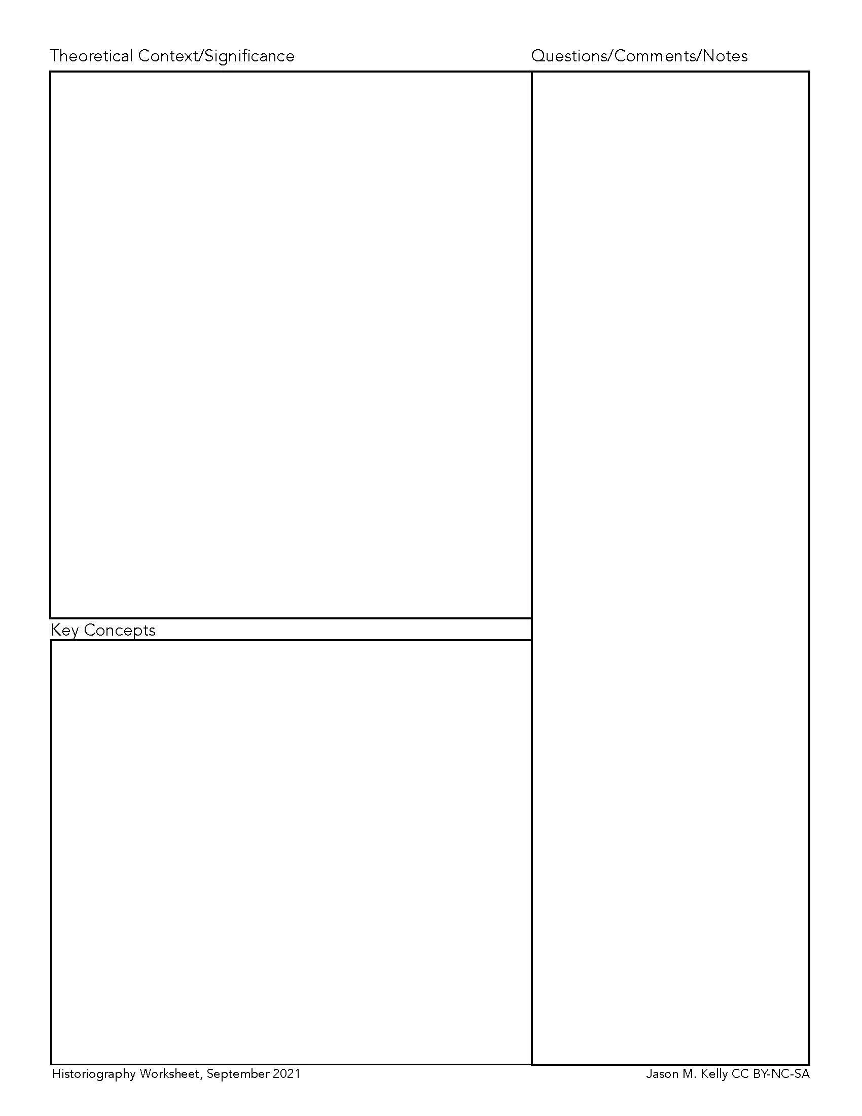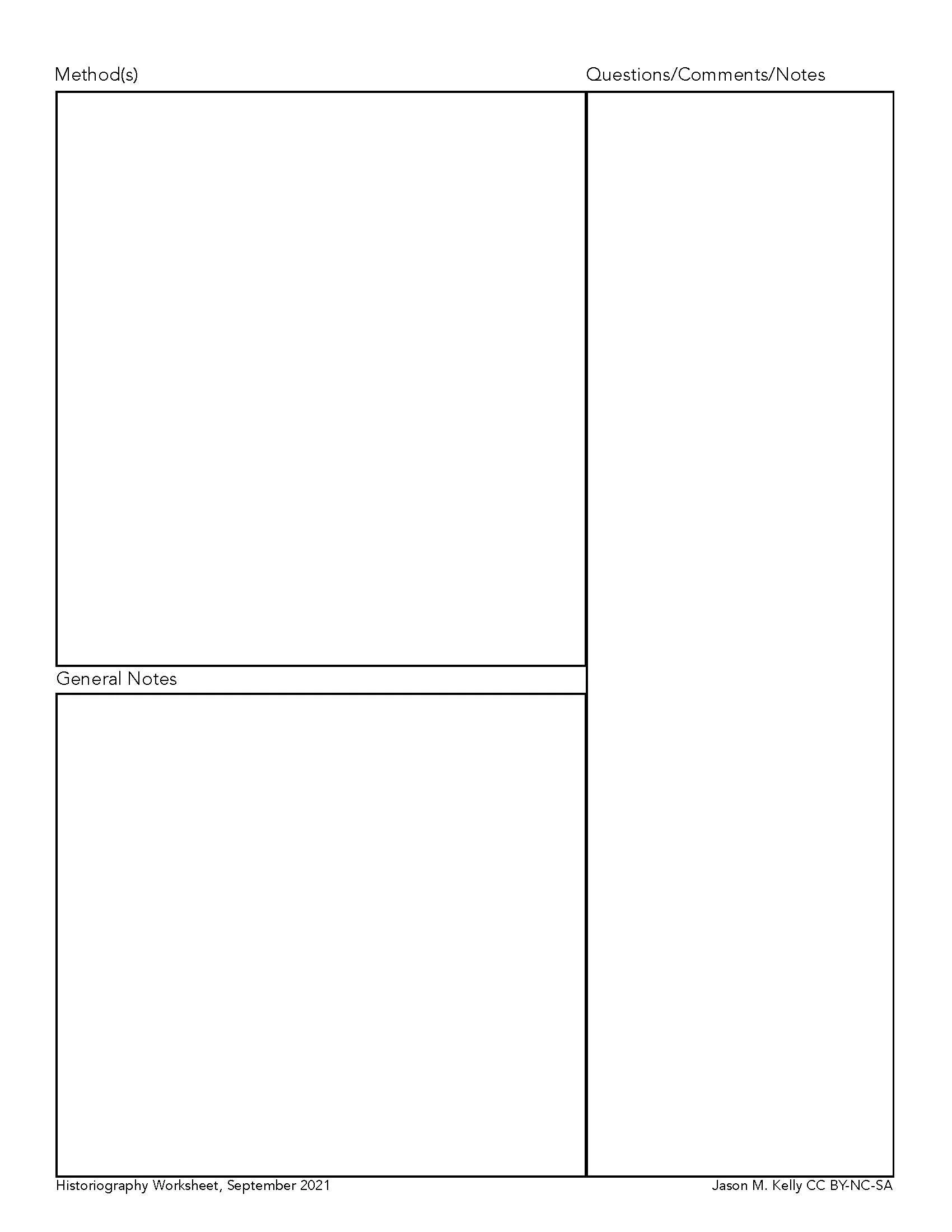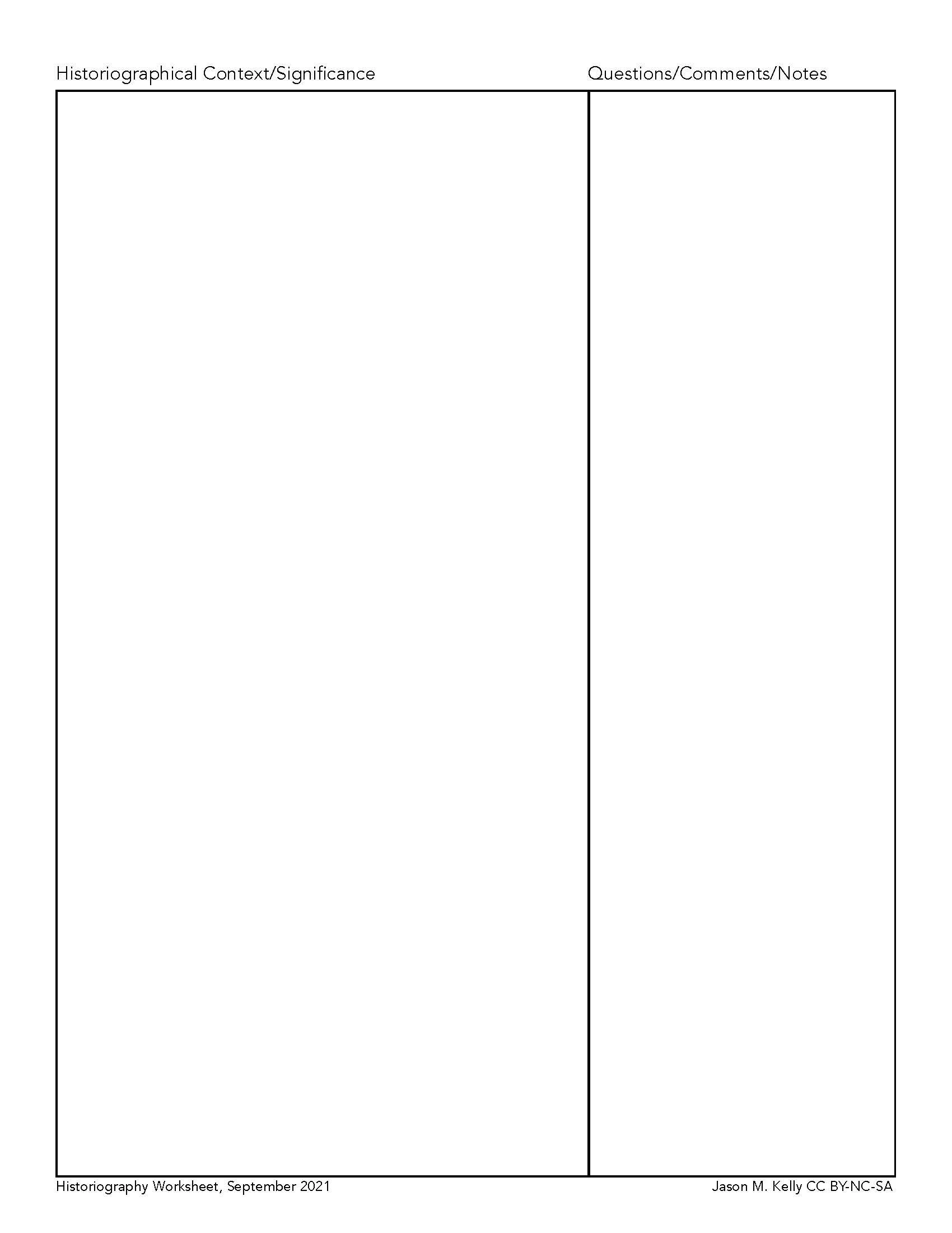 While I use historiographical worksheets as a pedagogical tool. I encourage students at all levels to consider using these worksheets throughout their time at university--especially if they are in a graduate program. Not only are these worksheets useful for engaging with a text, but they are immensely valuable as note-taking tools in preparing for exams, comps, and writing the historiographical sections of theses and dissertations.