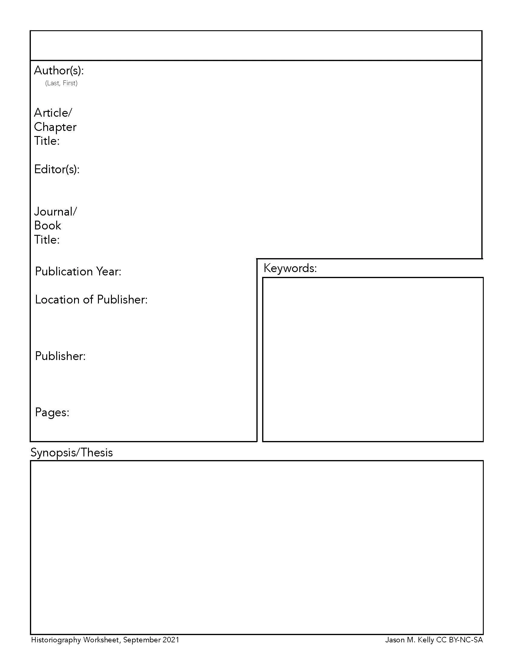 I use the historiographical worksheet for upper-level undergraduate and graduate courses. I distribute it as an interactive PDF, which allows students either to print it and fill out the sections on paper, to complete it in a PDF editor using the text boxes, or to write on it with a digital pen using their tablets. For students using the PDF editor approach, each text box is multi-line and scrollable, which allows them to include as many characters as they desire--even allowing them to cut and paste sections of text for reference.