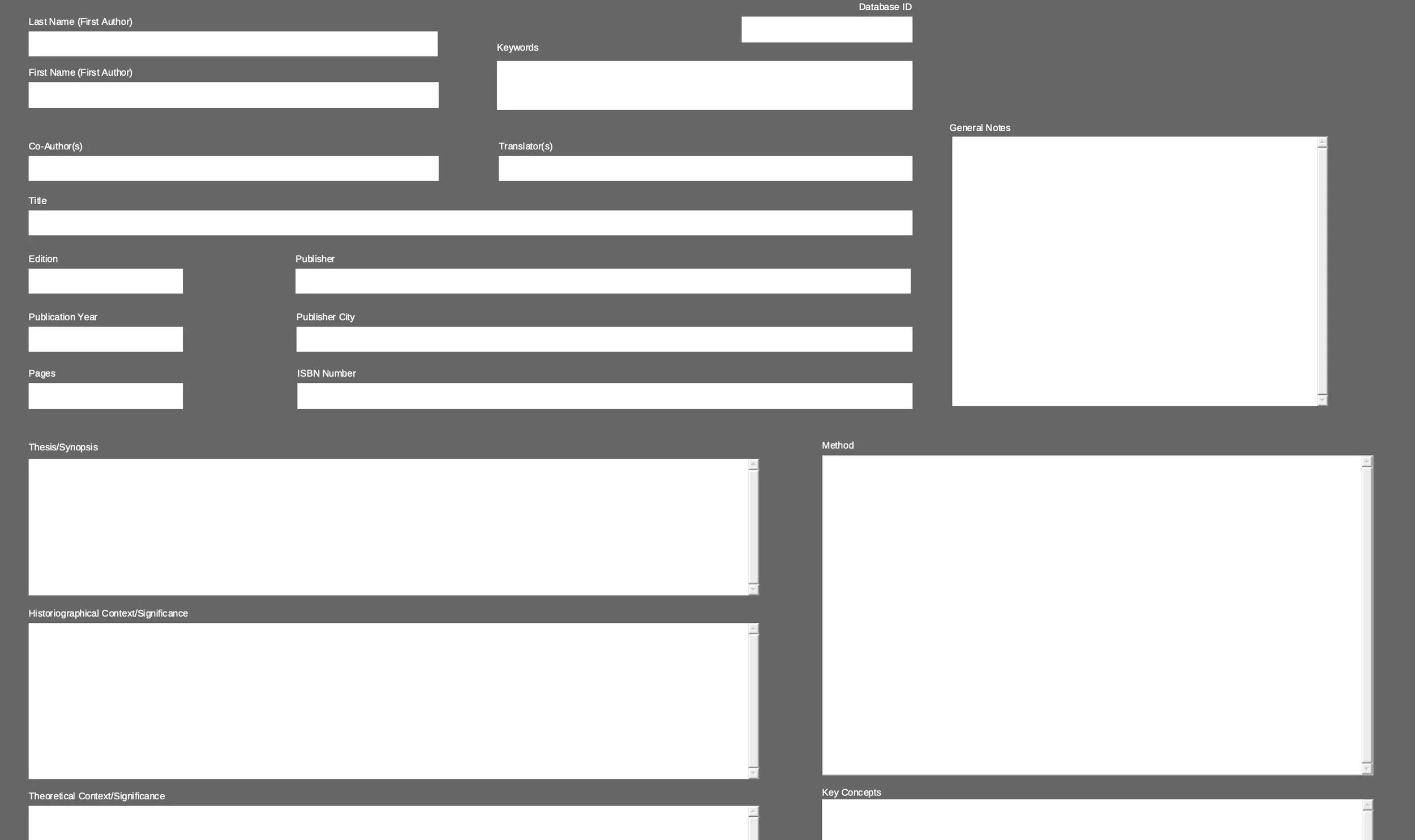 I am also a big fan of LibreOffice, a freeware office suite that rivals that of Microsoft and runs on Apple macOS, Windows, and Linux. Among the programs in LibreOffice is Base, a database program that is similar to Microsoft Access. I have created a Historiography Worksheet template for Base that allows users to store all of their notes in a database on their local computer rather than in a cloud service (don't forget your backups though!). Feel free to use it and expand/adapt it to your needs. You can download it from the FILES folder on my GitHub site.